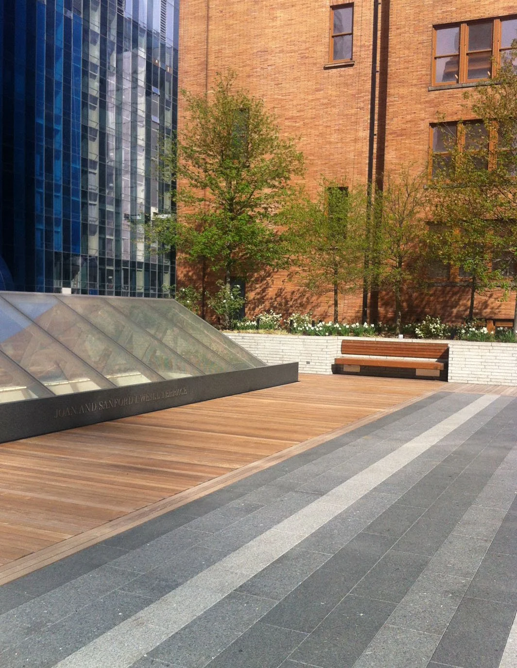 Carnegie Hall recently renovated its entire facility including the main concert hall and the two adjoining towers. The renovation created an opportunity for a rooftop terrace above the main concert hall that could host a variety of events and could serve as a semi-public space for its daily users. Elevated roughly eight floors above 8th Avenue, the terrace provides a quiet outdoor space in the heart of the city with views of central park. A flat plane of wood decking, flush skylights, and granite pavers is framed a woodland garden on two sides and lawn panels on the two other sides. The canopy trees within the woodland garden are intentionally located on the inside edge of the terrace to insure the historic views of the western and northern facades were not visually compromised by the new terrace. Additionally, to support the weight of all the plant material, soil, and stone paving, the original steel trusses were significantly reinforced and a new concrete sub-deck was installed.