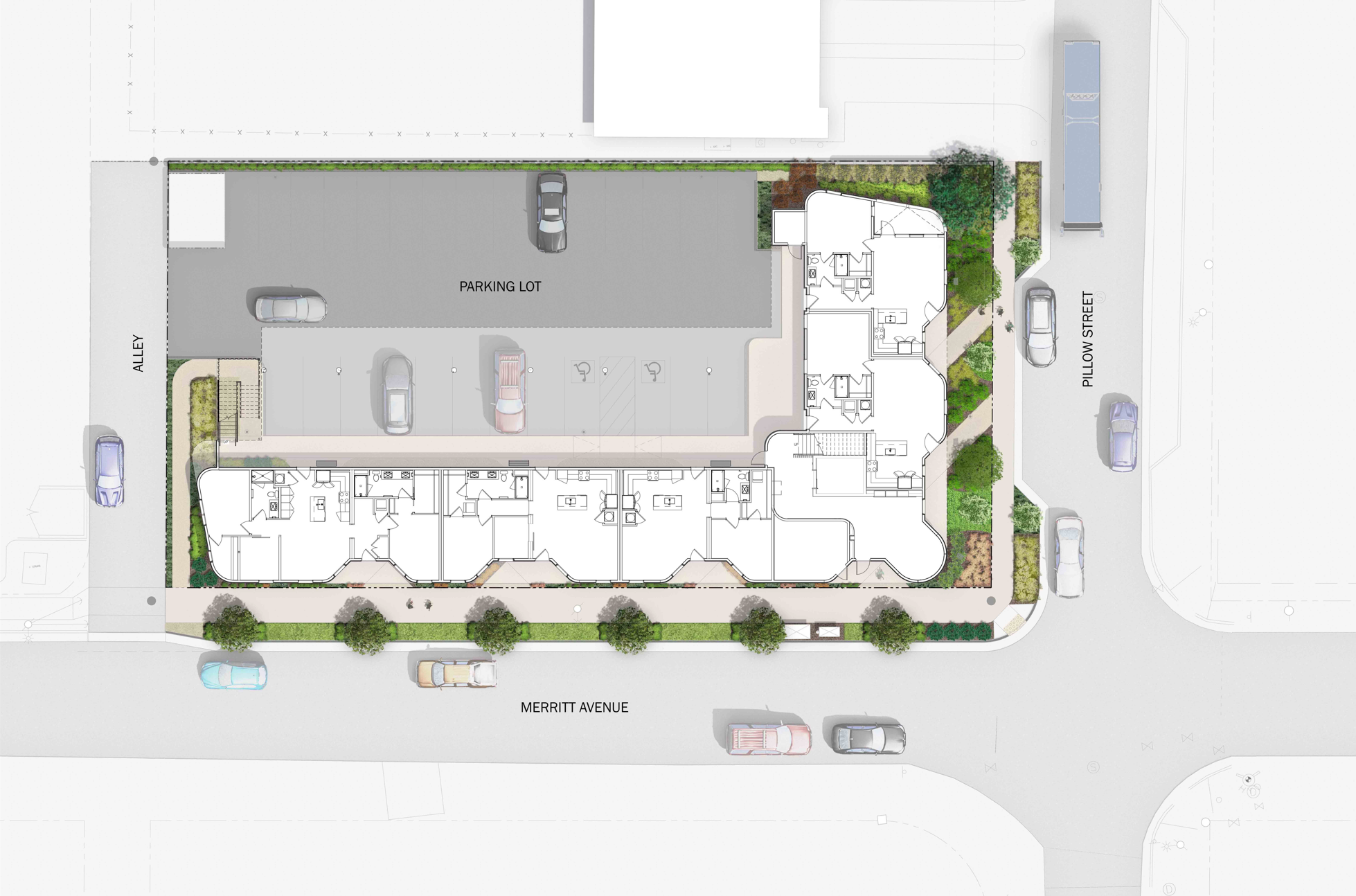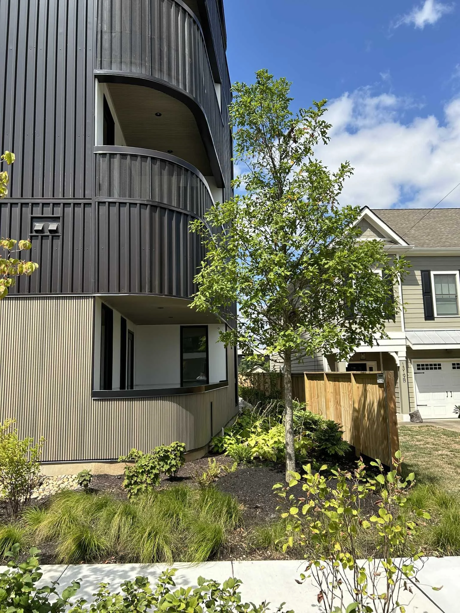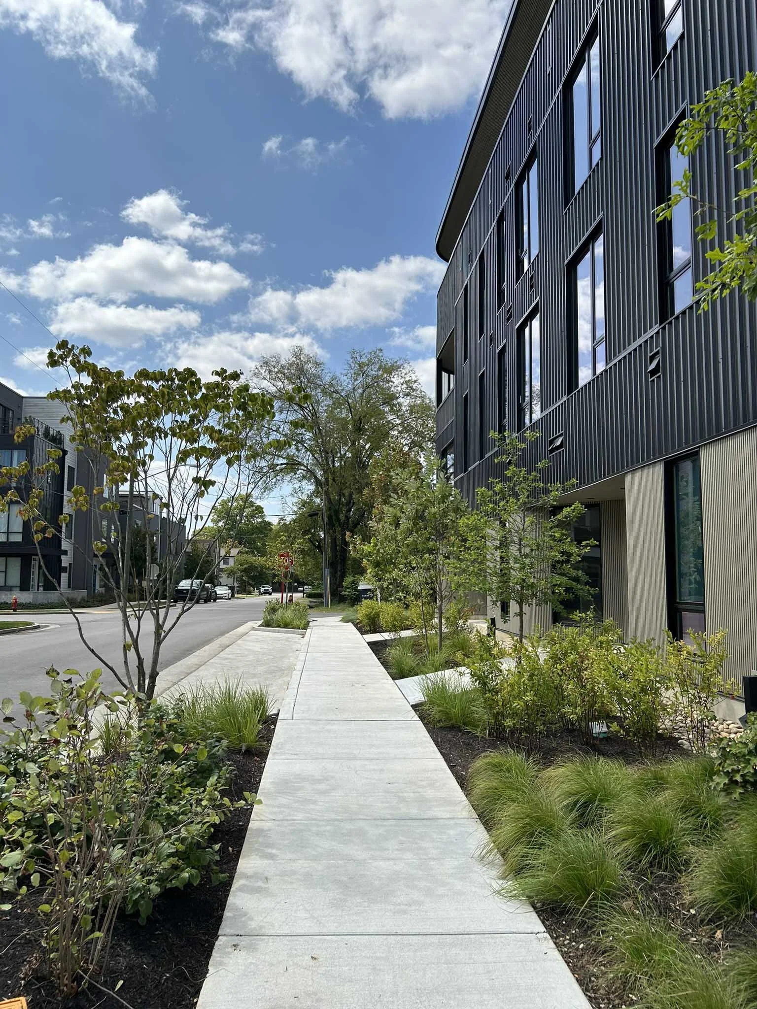 Pillow Street is a multi-family residential project located in the Wedgewood-Houston neighborhood of Nashville. The landscape seeks to create a lush planting along the buildings street and rear facades, using a planting palette of majority native species. A focus of tree planting was a primary design narrative, as the trees along the street reach maturity, the unit balconies and windows take on a changing view, transitioning to living among the new canopy.