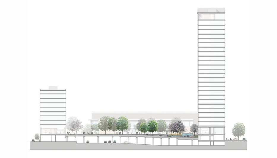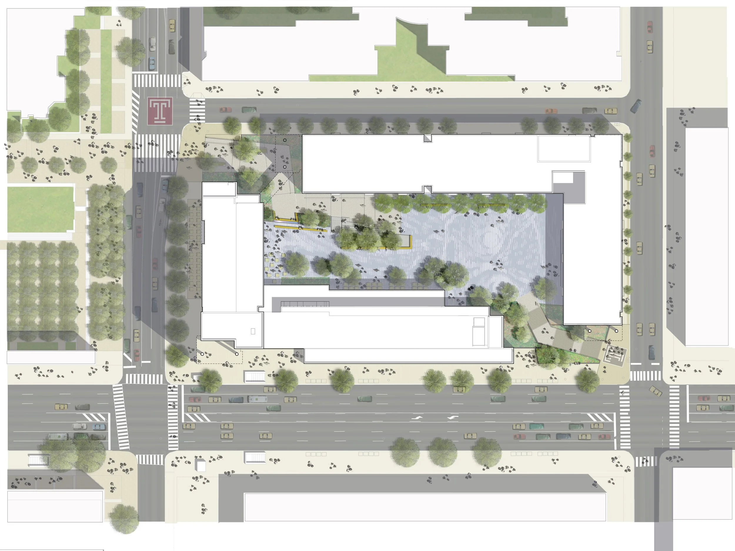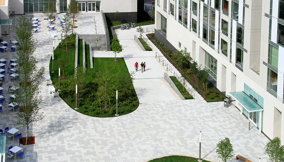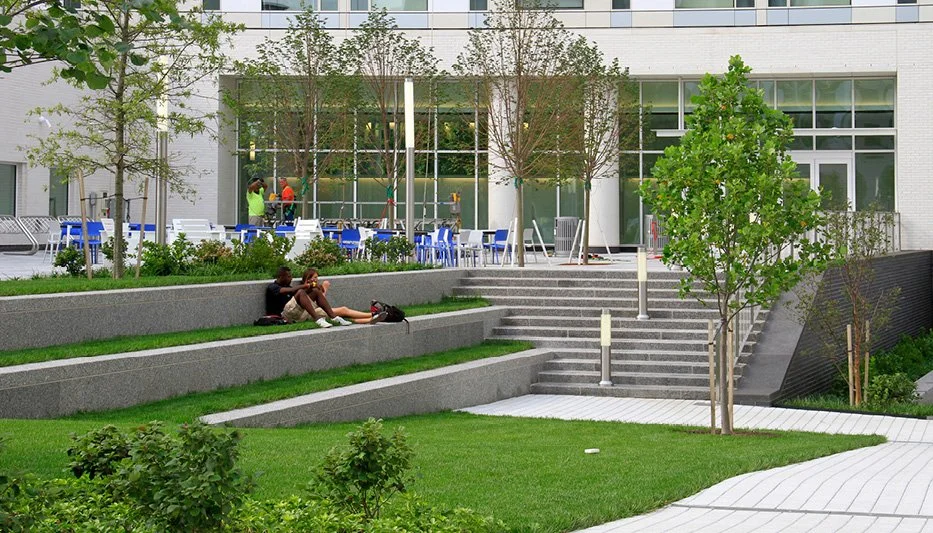 The complex consists of a midrise and high rise dormitory for approximately 1,500 undergraduate students, a dining hall, and a below grade parking structure with integrated service areas. Occupying one city block at the southern edge of campus, the complex is designed to be a new iconic gateway that links students and the community to the university's primary north/south pedestrian walkway. A fully accessible central courtyard built above the parking structure includes a variety of spaces for socializing and eating, a large lawn for passive recreation, movable furnishings, and a small linear amphitheatre. Durable shrubs, grasses, groundcovers, and trees unify the courtyard while delineating a series of outdoor rooms that can be creatively used for a variety of events such as a farmer's market, art show, or outdoor movie.